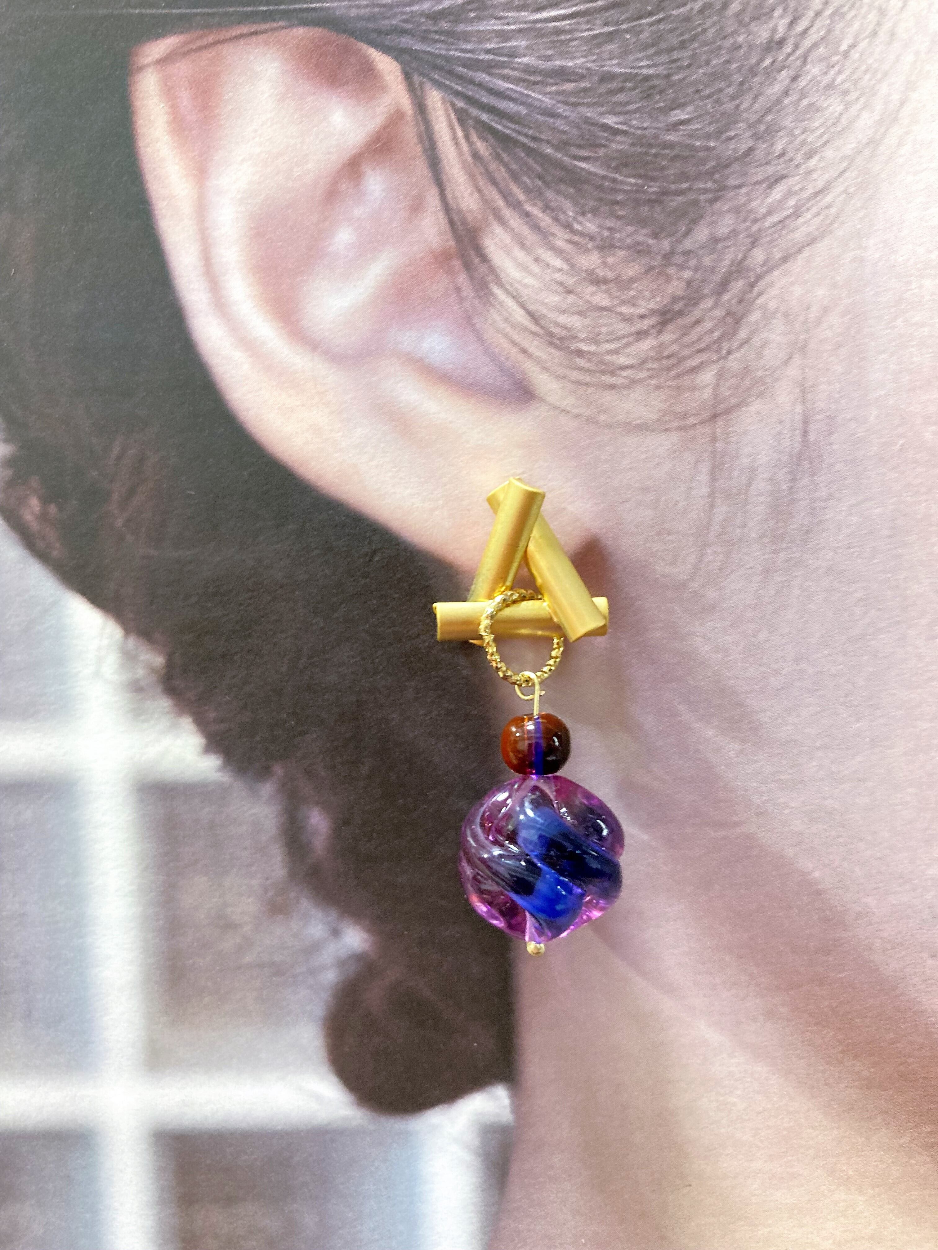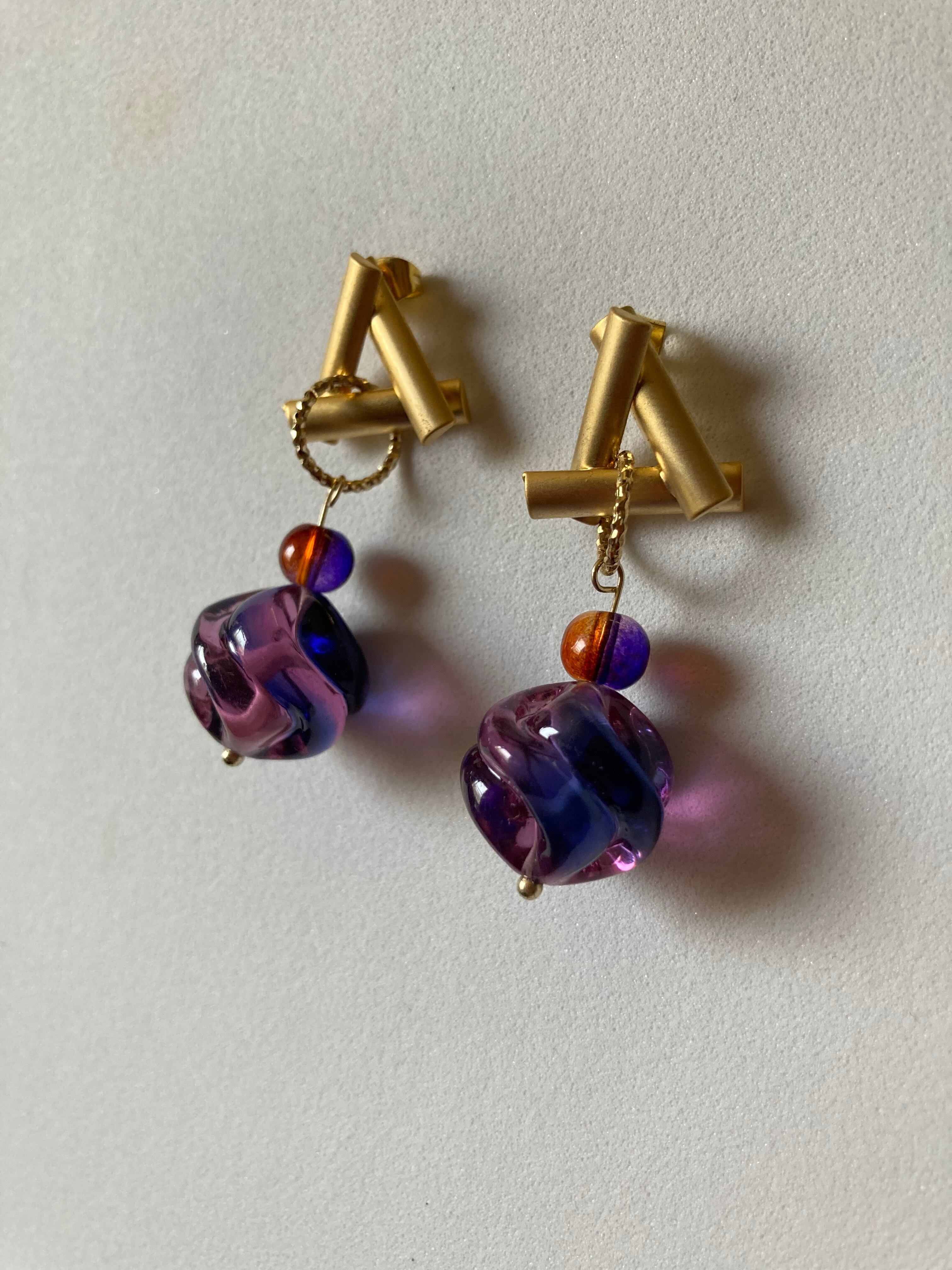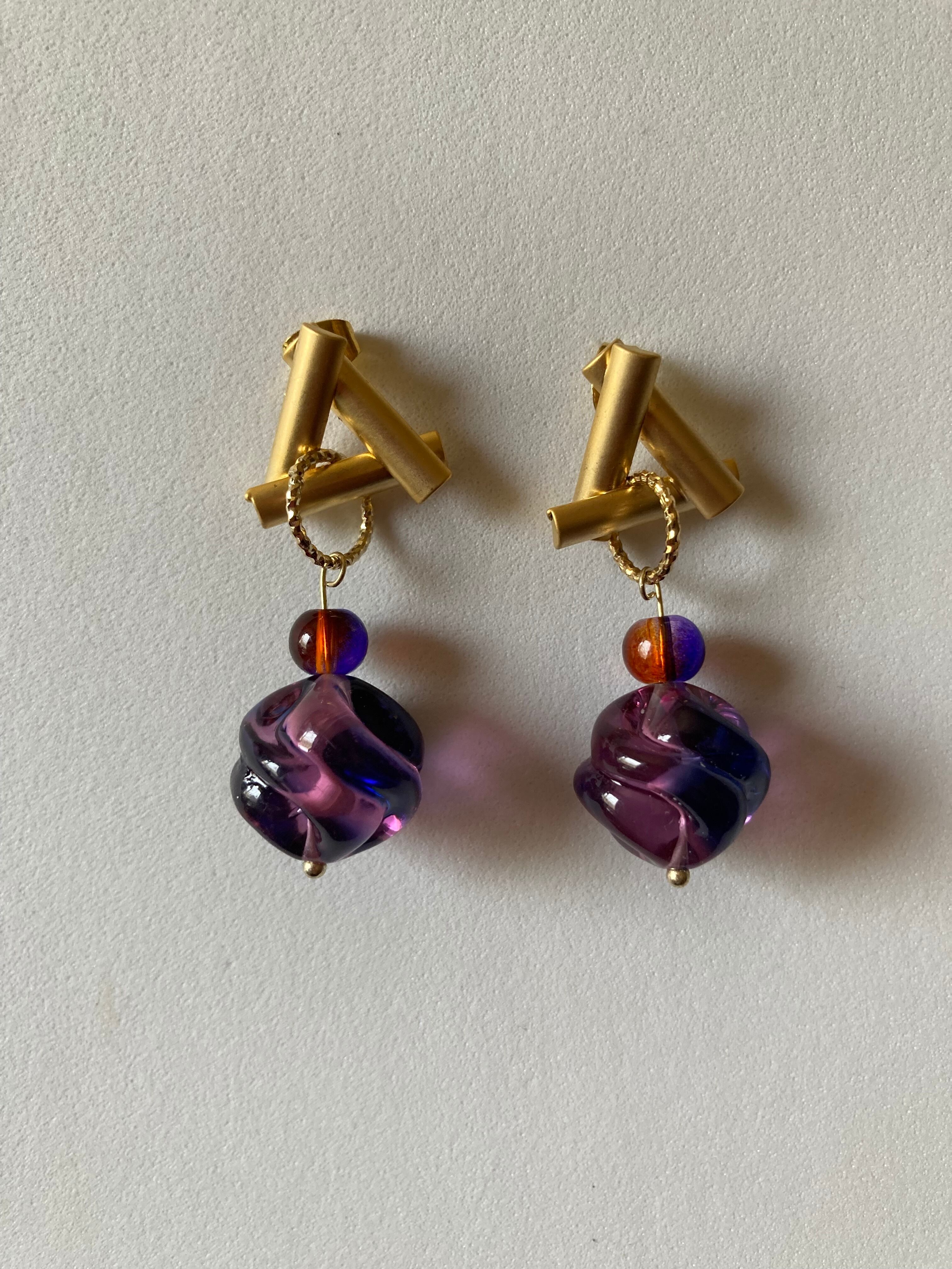 個性的なデザインスタッドピアスに、ブルーパープルの色合いが楽しいビーズを合わせてみました。
